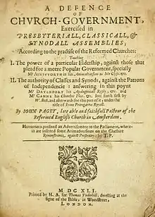 - Paget, John (1641). Paget, Thomas; Paget, Robert (eds.). A Defence Of Church-Government, Exercised in Presbyteriall, Classicall, & Synodall Assemblies. London: Thomas Underhill. Retrieved 10 October 2015.