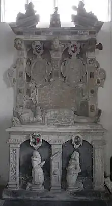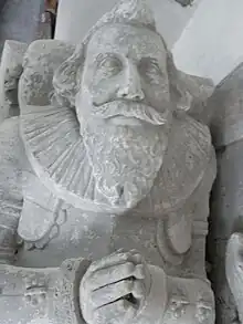 This monument situated against the north wall of the north transept serves as a memorial to five generations of the Giffard family of Brightley, the principal manor within the parish of Chittlehampton. It was erected in 1625 by John Giffard (1602–1665), then a young man, shown kneeling at the bottom right, ostensibly as a monument to his grandfather John Giffard (died 1622), whose heir he was and who is represented by the main recumbent effigy. The young John's father Arthur Giffard (died 1616), who died during his own father's lifetime and thus never inherited Brightley, is shown kneeling opposite his son at the bottom left, praying before a book placed on a prie dieu. Two renaissance-style stone medallions showing faces in profile sculpted in relief are positioned above the recumbent effigy and, as is indicated by the heraldry, represent on the left Sir Roger Giffard (died 1547) who married Margaret Cobleigh, heiress of Brightley, and on the right his son John Giffard (1524-1623), who by his wife Mary Grenville, was the father of John Giffard (died 1622), the recumbent effigy below him.[24] On a panel directly above the recumbent effigy is an inscription in Latin, translated into English thus: