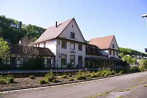 The Brilon Wald station is a station on the Upper Ruhr Valley Railway (German: Obere Ruhrtalbahn) in the German state of North Rhine-Westphalia. It was opened 5.5 km south of Brilon in the forest (Wald) with the construction of the line on 10 February 1873, as it was impractical to build the railway through Brilon. The station was called Brilon-Corbach until 1880, when the current name was adopted.[4] The Bergisch-Märkische Railway Company (Bergisch-Märkische Eisenbahn-Gesellschaft) created the small town of Brilon Wald at the same time. The station is classified by Deutsche Bahn as a category 5 station.[1]