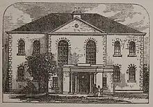 An illustration in James Thin's history of the congregation shows the church as a neoclassical building with round-headed windows and a façade centred on a pedimented gable containing an oculus and surmounted by a chimney stack. Beneath the pediment are two large windows. On the ground floor is the extension of 1820: an advanced porch including an attic storey and Ionic pillars in antis. Either side of the central bay are bays of two storeys with two windows on each storey.[67]