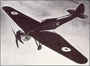 Weight saving was a priority and the airframe, other than the steel tube engine mount and cowling, used a wood shell.[14][2] It with a plywood skin glued to the mahogany longerons and struts that formed the internal structure, which was faired throughout to reduce drag. A conventional fixed undercarriage was used as it was more important to reduce the weight than the drag, and a retractable undercarriage would have been counterproductive.[14] The wings were constructed in three sections with a centre section integral with the fuselage. Three spars with plywood webs and mahogany flanges were used, covered with plywood sheeting.[14]
