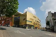 From 2007 to 2009, the Colston Hall underwent extensive refurbishment with the construction of a new foyer alongside the present building by Willmott Dixon, topped by a wind turbine.[27][28] With the provision of several new bars in the new foyer building, the old bar area (formerly the Lesser Colston Hall and Little Theatre) was returned to performance use as The Lantern, accommodating a standing audience of 350. The redeveloped complex also provided additional performance spaces, meeting rooms, and restaurants.[29]