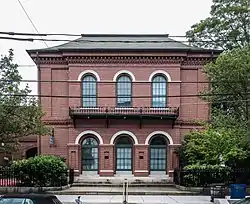 The land for the site was acquired on April 19, 1856 for $4,400 and constructed in 1857 for a cost of $22,135.75.[2] Completed in 1858 from the design by Ammi B. Young, the Bristol Customshouse and Post Office is a two-story rectangular Italian palazzo style brick building that rests upon a raised granite base.[3] The building is about 46 feet (14 m) by 32 feet (9.8 m) and is heated by steam.[2] The front facade is made of deep red brick that has three large arched openings on both stories and a "greyish sandstone molding outlines the arches on both floors and caps the piers which separate the first-floor arches and a decisive molding of the same material forms a belt between the two stories."[3] The archways protrude from the side of the building and the center archway serves as the first floor with the adjacent archways housing large windows that are barred with iron. As it typical of the style, the second floor is more elaborate with a shallow balcony of iron supported by iron brackets and the paneling of the upper facade is "understated, but the surmounting entablature is heavy and elaborately decorated."[3] The cornice as the visual top of the building and conceals the low hipped roof that is only visible from a distance. The sides and rear are similar to the front facade, but include blind recesses and the molding is of a browner sandstone.[3]