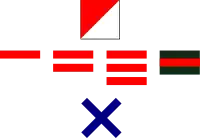 The practice of wearing battalion specific insignia (often called battle patches) in the B.E.F. began in mid 1915 with the arrival of units of Kitchener's Armies and was widespread after the Somme Battles of 1916.[55] The patches shown were adopted by the division during late 1917, and were designed to a brigade scheme including a brigade sign worn by all ranks on the back, below the collar. Those signs for the 92nd and 93rd brigades indicated the battalion seniority, all brigades wore their battalion, M.G. company and T.M. battery signs at the top of both sleeves.[56]