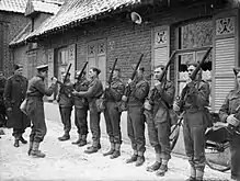 During the Second World War, the 5th Brigade was again part of the 2nd Infantry Division and was sent to France in 1939 shortly after the outbreak of war, where it joined the British Expeditionary Force. It served on the Franco-Belgian border until May 1940, when it was evacuated at Dunkirk after fighting in the short but fierce battles of France and Belgium in which the German Army nearly cut off the entire BEF from the French Army.[5] With the division, the brigade remained in Britain on home defence until 10 April 1942, when it was shipped out to India to fight the Imperial Japanese Army after a series of disasters suffered by the British and Indian troops stationed there. The 5th Brigade served with the 2nd Infantry Division in the Burma Campaign under General Slim's British Fourteenth Army and fought in the Battle of Kohima, which managed to help turn the tide of the campaign in the Far East.[6]