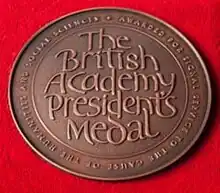 - British Academy President's Medal, created in 2010 and awarded to up to five recipients each year who have demonstrated "signal service to the cause of the humanities and social sciences"[18]