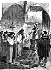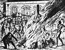 While there were a number of Anabaptists executed after Joan Bocher, the next notable one is Bartholomew Legate. The Legate family were a well-known family in Essex. The Legate brothers were Walter, Thomas and Bartholomew and were known for their separatist opinions and Anabaptist beliefs, like arguing that Christ was not really God and rejecting the Church structure and doctrines such as the sacraments.[27] Bartholomew Legate is a famous martyr since he was one of the last heretics to be burned at the stake for religious heresy in England on 18 March 1611.[28] They were one of the last public executions since it scared commoners and they were ordered to death because of the problems they caused in the government. This execution was more of a casualty than merely being burned for their theological differences. The Anabaptists got in the way of the government more than getting in the way of the church, therefore James I dealt with people like Bartholomew Legate in this manner.