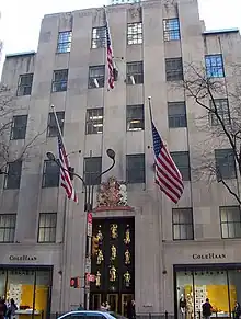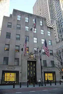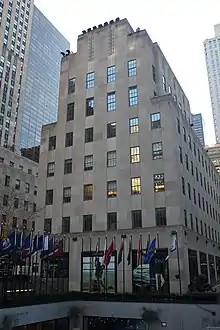 As American tenants were reluctant to rent in these retail buildings, Rockefeller Center manager Hugh Robertson, formerly of Todd, Robertson and Todd, suggested foreign tenants for the buildings.[89][90] The complex's managers promoted Rockefeller Center as a "hub for international trade".[9] Rockefeller Center's managers held talks with prospective Czech, German, Italian, and Swedish lessees who could potentially occupy the six-story internationally themed buildings on Fifth Avenue. Dutch, Chinese, Japanese, and Russian tenants were also reportedly considered.[84][89][90] The British government leased the building in January 1932,[91] making it the first themed building for which an agreement was made.[34][92][82] The building was to be a free port, with all of its merchandise being exempted from tariffs,[93] and it would host the governmental and commercial ventures of the United Kingdom.[82][92] The seventh-story penthouse above the building was added late in the design process.[24]