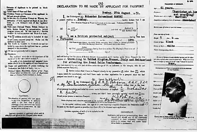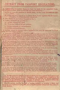 The Indian Passport Act of 1920 required the use of passports, established controls on the foreign travel of Indians, and foreigners travelling to and within the provinces of India.[3] The passport was based on the format agreed upon by the 1920 League of Nations International Conference on Passports.[4]