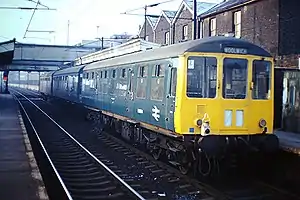 A product of British Rail's Modernisation Plan of 1954,[2] the 104s were designed for general branch line and commuter routes.[3] The first units ordered were for the London Midland Region, with the majority of the class for use in North West of England. The Class 110 was a re-engineered version of the 104 with more powerful engines, but did not last as long in service. The 104s had asbestos insulation removed during the 1970s.[4]