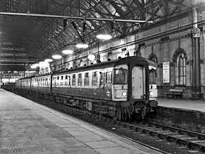 ![]() A mixed four car DMU stands at Manchester Piccadilly in 1984. The two driving coaches are from a class 123 and the middle coaches are from class 124 units. | |