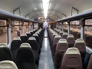 The Class 143 shared a high degree of similarity to the design of the Class 141. However, one major area of change is that both the Class 142 and Class 143 featured a noticeably wider body, instead of adhering to the width of the standard bus as per the Class 141; specifically, the width was expanded to the maximum amount permissible to remain within the loading gauge.[7] This resulting in an increased internal area to accommodate passengers within, enabling a three-by-two seating arrangement to be installed for a total capacity of 121 seats. The increased seating was particularly useful as, in addition to their use on rural feeder services, the Class 143's use on short range urban services had been foreseen by BR planners.[7]