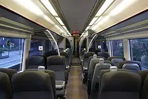 A typical Class 168 consists of 2+2 standard-class seating throughout, arranged either around tables or in airline-style seating with pull-down tables. The majority of seats are facing seats. The Class 168 is carpeted throughout with luggage racks, air conditioning, and two or more toilets per set (one for disabled users, with baby changing facilities). Passenger information systems are fitted in every car and on the outside of class 168/2 cars.
