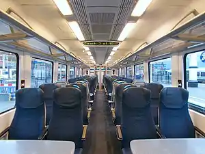 South Western Railway has conducted a refurbishment programme under its contract from 2017 onwards. As part of this work, every unit has been deep cleaned, and the carpets and seat covers in standard class replaced. In addition, plug sockets have been provided at every pair of seats, and the buffet unit has been removed to provide extra seats. First class has been reduced from 35 seats to 32, and the 2+1 seating has been replaced with 2+2 seating, with leather seats and new tables providing facilities for wireless charging.[16]