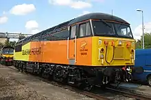 The Class 56 is a heavy freight-orientated diesel-electric locomotive. Upon its introduction, the type arguably represented the first of the "second generation" of British diesel locomotives. When specifying its requirements for the Class 56, BR stipulated that its bodyshell design and many mechanism parts would be from Brush Traction's existing Class 47 design, minus some features such as the obsolete headcode panel.[4] Accordingly, it features a stress-skin manner of construction that was paired with an all-welded monocoque superstructure assembly.