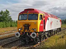 The Class 57 is a re-engineered diesel locomotive that was rebuilt from redundant Class 47 locomotives by Brush Traction at their Loughborough facility. The locomotives are fitted with a refurbished Electro-Motive Diesel (EMD) engine and a re-conditioned alternator, improving reliability and performance.[5] There are three variants of the Class 57, one designed for freight traffic (57/0) and two to perform passenger operations. Each locomotive reportedly cost £300,000, about one-third that of a new-build locomotive.[6][7]