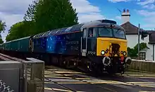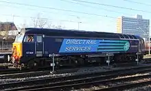 The mixed-traffic operator Direct Rail Services (DRS) currently operate nine class 57/0s—comprising 57002-57003 and 57007-57012, leased from Porterbrook. During April 2012, DRS agreed terms with Porterbrook to lease 57302, 57305, and 57309 via a three-year deal.[11] In December 2012, DRS started provided locomotives to the passenger train operator Virgin Trains West Coast. Another three Class 57/3s were leased as part of the deal, however, two of these had entered warm storage within two years. During July 2014, DRS took over the leases of the remaining six Class 57/3s from the national railway infrastructure owner Network Rail.[12][13] In June 2023, six were returned to Porterbrook with five moving to GB Railfreight and one to Great Western Railway, leaving DRS with 57304, 57307, 57308 and 57309.[14]
