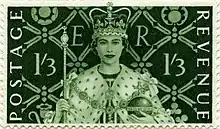 A set of four stamps was issued in 1936 for Edward VIII before he abdicated.[14] George VI's coronation was marked with a commemorative: part of an omnibus issue which included every colony in the Empire. New definitives featured a profile of the King on a solid colour background, based on a plaster cast by Edmund Dulac.[15] This was a precursor of the Machins three decades later: see below.