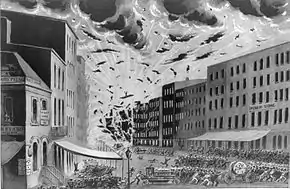 The 1835 Great Fire of New York destroyed whatever historical buildings were left from the early times of New Amsterdam/New York. Much of the street was destroyed again in the Great New York City Fire of 1845. In the first two hours of the fire's spread, it reached a large multi-story warehouse occupied by Crocker & Warren on Broad Street, where a large quantity of combustible saltpeter was stored.[17][18] In July 1863,[19][20] the New York Draft Riot in Manhattan became the largest civil insurrection in American history apart from the Civil War.[21] Upon the outbreak of this riot, Jacob B. Warlow and his police unit contended with a mob on Broad Street,[20] with Warlow also helping quell other riots throughout the city from his station house on Broad Street.[22] As the area became the center of financial activity, all smaller buildings in turn were replaced with grand banks. Most of the structures that stand today date from the turn of the 20th century.