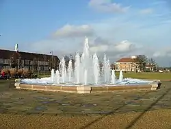 Broadway Gardens (originally named Town Square and later, from the mid-1960s, John F Kennedy Gardens) is 850 metres (2,790 ft) north of Hitchin Road.[1] It was developed in recent years with a grant from the Heritage Lottery Fund. There is a fountain, herbaceous borders and a large open space where events can be hosted.[4] Overlooking the gardens are the Town Hall (built in 1935), the library (1938), the town museum (1914–20) and the former grammar school (1931). Broadway passes the Gardens on both sides; north of the Gardens, Broadway is divided by a central boulevard where a tramway was originally intended, now a central walk.[1]