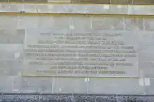 The main entrance is flanked by two large mulberry trees believed to have been planted during the 1850s. Inside the monument's base are a number of brass plaques: Brock and Macdonell's epitaphs, a list of donors and builders, and a tribute to the British, Canadian, and First Nations soldiers who died at the Battle of Queenston Heights. The two bodies are interred in crypts within the limestone walls. More recent educational displays outline Brock's life, the battle, and the monument's history—including a portion of Brock's former limestone arm that collapsed in 1929.