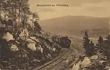 The Brocken Railway leaves Drei Annen Hohne station (542 m above NN), like the Harz Railway, in a southwesterly direction. As it leaves the station, however, it crosses the road to Schierke/Elend and then enters the Harz National Park. It then heads west to Schierke station (688 m), where until 1963, there was a siding to Knaupsholz granite quarry at about the half-way point. The line then runs for some distance along the valley of the Cold Bode, which lies south and far below the line. Next the 971 m high mountain, the Wurmberg, appears on the left, and the train crosses the Brocken Road for the first time.