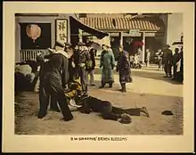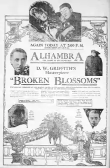 Broken Blossoms premiered in May 1919, at George M. Cohan's Theatre in New York City as part of the D. W. Griffith Repertory Season.[11] According to Lillian Gish's autobiography, theaters were decorated with flowers, moon lanterns and beautiful Chinese brocaded draperies for the premiere. Critics and audiences were pleased with Griffith's follow-up film to his 1916 epic Intolerance.[12] Contrasting with Intolerance's grand story, set and length, Griffith charmed audiences by the delicacy with which Broken Blossoms handled such a complex subject.