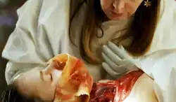 ![]() Megan Hunt (Dana Delany) (above) with victim Nikki Parkson (Mary Fegreus) (below). This shows the neck of Nikki, noting the bruising to show strangulation, with the detail called "fascinating". | |
