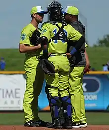 Patrick (right) holding a mound visit as the pitching coach of the El Paso Chihuahuas in 2019
