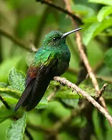 The bronze-tailed plumeleteer (Chalybura urochrysia) is a species of hummingbird in the "emeralds", tribe Trochilini of subfamily Trochilinae. It is found in Colombia, Costa Rica, Ecuador, Nicaragua, and Panama.[3][4]