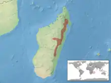B. thieli is found in eastern Madagascar, and its type locality is Ambodimanga, Madagascar.[3] It can be found from Ranomafana (southwards) to Anjanaharibe-Sud (northwards), and the species has previously been found in Ambohitantely, Angavo-Anjozorobe, Analamazaotra, Mantadia, Marojejy, and Vohidrazana at elevations between 875 and 1,200 m (2,871 and 3,937 ft) above mean sea level. It is believed to be found in around 43,865 km2 (16,936 sq mi) of land.[4] Its preferred natural habitat is forest.[1]