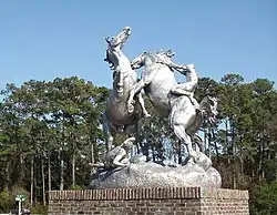 About 1,445 works of American figurative sculpture are displayed at the Archer and Anna Hyatt Huntington Sculpture Garden. Many of the works are by Hyatt Huntington, but other artists are also featured. Walkways and garden paths link the sculptures in their distinctive garden, fountain, or landscape settings, with vistas of the scenery surrounding them. A 1,600-acre (650 ha) area of Brookgreen Gardens was listed on the National Register of Historic Places in 1978.[2] The sculpture garden portion, 551 acres (223 ha), of Brookgreen Gardens was included in the designation of Atalaya and Brookgreen Gardens as a National Historic Landmark in 1984.[5][6] Atalaya Castle is just across U.S. 17, which cuts through the former combined Huntington property. A seventy-inch long sea horse, sculpted by Joseph Kiselewski,[7] was place in Brookgreen Gardens in 1942.