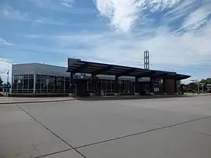 Brooklyn Center Transit Center (BCTC) is a transit center in the Minneapolis suburb of Brooklyn Center, Minnesota. Owned and operated by Metro Transit, it is one of the busiest single boarding locations in the Twin Cities. The transit center is not a park and ride, but provides free 10-minute parking and free outdoor bike racks.[2] June 8, 2019 Metro Transit's second bus rapid transit line, the Metro C Line, opened with Brooklyn Center Transit Center as the line's northern terminus.[3][4] The Metro D Line opened in December 2022, also using the center as its northern terminus. The transit center opened December 4th, 2004 and cost $1.9 million.[5] Before opening of the C Line, charging stations were installed for end-of-the-line charging of 8 battery electric buses used on the C Line and D Line.[6]