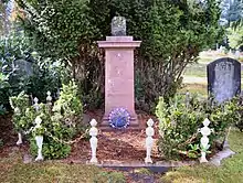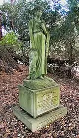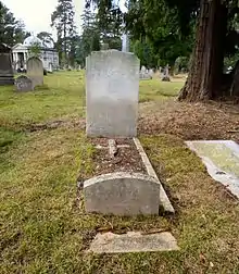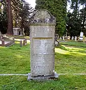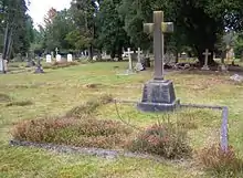 The first burial was of the stillborn twins of a Mr and Mrs Hore of Ewer Street, The Borough.[28] The Hore twins, along with the other burials on the first day, were pauper funerals and buried in unmarked graves.[28] The first burial at Brookwood with a permanent memorial was that of Lieutenant-General Sir Henry Goldfinch, buried on 25 November 1854, the 26th person to be buried in the cemetery.[29] The first permanent memorial erected in the Nonconformist section of the cemetery was that of Charles Milligan Hogg, son of botanist Robert Hogg, buried on 12 December 1854.[30] Goldfinch and Hogg's graves are not the oldest monuments in the cemetery, as on occasion gravestones were relocated and re-erected during the relocation of existing burial grounds to Brookwood.[31]