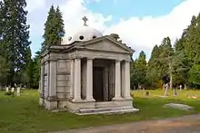 In 1878, the LNC sold an isolated piece of its land at Brookwood, close to St John's village, to the Cremation Society of Great Britain, on which they built Woking Crematorium, the first in Britain, in 1879.[35] While the LNC never built its own crematorium, in 1910, Lord Cadogan decided he no longer wanted to be interred in the mausoleum he had commissioned at Brookwood. This building, the largest mausoleum in the cemetery, was bought by the LNC, fitted with shelves and niches to hold urns, and used as a dedicated columbarium from then on.[36]
