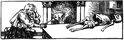 Brother Lustig ordered a pot and some water, and after sending everyone out, he cut the limbs from the dead princess and dropped them in the boiling water until the flesh and muscle dropped from the bones. Then taking the white bones he laid them out on a table, as he had seen St Peter do, but not knowing the correct order he lay them in the wrong place. Then, in a loud voice he cried out, "In the name of the Holy Trinity, little girl arise!" This he commanded three times, but the bones did not arise, and Brother Lustig in a panic cried, "Get up, get up, or you will be sorry!" Just then St Peter returned in his former guise as a discharged soldier. Climbing through the window, he demanded "You Godless man! What are you doing? The girl will not arise as you have laid her bones in a confused state! This once I will help you, but you must never do such a thing again and you must accept no reward, no matter how small, from the king."