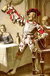 A poem from Achim von Arnim's Master Songs (No. 232) of 1550 has a soldier begging for food while his companion St Peter wants to preach. St. Peter heals the local mayor for which he is rewarded with thirty guilders and a chicken, which they cook. Peter's soldier companion secretly eats the liver from the chicken that Peter wanted for himself. The soldier confesses when Peter divides the thirty guilders reward into three parts, the third part being for whoever had eaten the liver.[3]