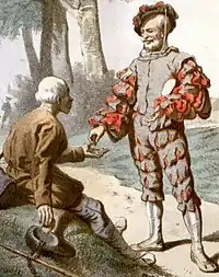 The tale of Brother Lustig is a long story involving a large cast of characters and various elements of the Aarne–Thompson type 785: Who Ate the Lamb's Heart?; type 753A: The Unsuccessful Resuscitation; type 330B: The Devil in the Sack; and type 330: Entering Heaven by a Trick.[1] In German 'lustig' can mean 'funny' or 'merry' and 'lazy'. The Brothers Grimm tell two stories in which the main characters try to fool the Devil, St Peter and God - Brother Lustig and Gambling Hansel (De Spielhansl), KHM 82.[2] The tale concerns a man who starts out as charitable and caring, sharing three quarters of all he possesses with what he thinks is a series of poor beggars - in reality St Peter - who at first is impressed with Brother Lustig and decides to travel with him. But the two quickly go off each other as St Peter discovers that his companion lies and steals and disobeys a saint while Brother Lustig regards his fellow-traveller as a fool for refusing generous rewards. However, despite these character flaws Brother Lustig still manages to cheat his way into heaven.