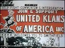 "Ethridge began working in Smithfield in the mid-1970s, one of two lawyers who were the first blacks to set up a practice in Johnston County. In those days, a billboard greeted people driving into town on U.S. 70 with the words 'The KKKK welcomes you to Smithfield'" - ↑ Sims, Patsy. The Klan, Chapter 3, (New York: Stein and Day, 1978). ISBN 978-0-8128-2268-7