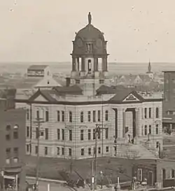 Work on a new courthouse in Aberdeen began by 1902,[7] designed by architects Frank W. Kinney and Menno S. Detweiler.[8][9] It was built by E. Miller of Le Mars, Iowa, and completed in 1904 at a cost of around $120,000.[2][10] Two half blocks of land were donated by several property owners and a street was removed for the courthouse site.[3][5] The courthouse was formally dedicated on March 15, 1904.[3][11] The old courthouse was demolished in 1905 and the site was turned into a park.[6][12]