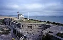 The first batteries at Browndown were erected on the shore at Browndown Point to the west end of Stokes Bay at Gosport to defend the western approach to Portsmouth harbour and to prevent an enemy landing on the beach. These batteries were known as Browndown Battery East and Browndown Battery West. They were complete by 1852 but were heavily criticised by James Fergusson (who was later to become the Treasury Representative on the 1860 Royal Commission into the defences of the United Kingdom) in his papers The Peril of Portsmouth and Portsmouth Protected.[2] According to an armament list of 1860 Browndown Battery East had positions for three 68pr of 112 cwt. and seven 8-inch smooth bore guns of 65 cwt. whilst Browndown Battery West had positions for three 68pr. and eight 8-inch smooth bore guns.[3] Ordnance Survey maps indicate the eastern battery had fallen in disuse by 1870[4] whilst the western one was retained until it was replaced by a new battery as part of the western defences of Portsmouth Harbour.