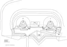 In 1890 it was proposed to update the armament of the Stokes Bay defences by adding two 6-inch and two 9.2-inch B.L. guns at either end of the Bay. These guns formed the standard coast defence artillery of this period and always operated in pairs of complementary guns to counter armoured and unarmoured ships (blockers).[10] Fort Gilkicker was remodeled for two 6 inch and two 9.2-inch B.L. guns at the east end of the bay whilst Stokes Bay Lines No.2 Battery was remodeled to hold the western two 6-inch B.L. guns. Its complementary guns, two 9.2-inch B.L. guns were to be fitted to Browndown Battery. The new battery had the usual shell and cartridge store between the two gun emplacements which were extended and enlarged from the old R.M.L.magazines. To the west of the magazines a cookhouse was added. Two crew shelters were also added in the extension. A Battery Command Post and telephone room were constructed above the Artillery Store at the west end. This communicated with the Battery Command post on No.2 Battery of the Stokes Bay Lines and with those at Fort Gilkicker.