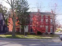 Bruce—Briggs Brick Block is a historic rowhouse block located at Lancaster in Erie County, New York. It is a mid-19th century brick structure unique in Western New York, which incorporates both Greek Revival and Italianate style decorative details. The rowhouses were built for George Bruce, one of the early settlers of Lancaster.[2]