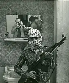 Reflection of Bruno Caruso photographing a guerilla fighter.