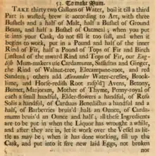 In contrast to German sources is mum in English literature from the early modern period an unhopped strong wheat-beer, made with the addition of various aromatic herbs.[5] The oldest English recipe seems to be published 1682 in The Natural history of coffee, thee, chocolate, tobacco by John Chamberlayne and is said to be recorded in Brunswick.[6]