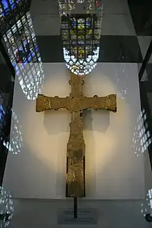 The Brussels Cross and its two-line inscription in Anglo-Saxon verse were first brought to public attention in modern times by H. Logeman in 1891. Traditionally reputed to contain the largest extant fragments of the True Cross, it has been preserved at the Cathedral of SS. Michel and Gudule since the middle of the seventeenth century. The cross is 46.5 by 28 cm. (18.3 by 11 inches) in size. The front was once covered by a jewelled gold plate, probably taken away by French soldiers under Dumouriez in 1793; the back is still covered with silver, with the symbols of the four evangelists at the ends of the four arms and the symbol of the Agnus Dei in the centre. The earlier Lothair Cross is a comparable work that is still intact. The name of the craftsman, Drahmal, is probably Norse and from the northern England, but nothing more can be deduced about him. Judging from the language of the inscription as well as from the epigraphy and the style of the images, the cross most likely dates from the beginning of the 11th century. The images are in a "stolid" version of the early "Winchester style".[1]