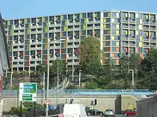The Broomhall complex consisted of a sprawling network of 27 mid-rise tower blocks alongside the A61 Hanover Way, nowadays part of the Sheffield Inner Ring Road, on the edge of Sheffield City Centre in Broomhall.[19] It was located across the dual carriageway from Hanover House. In terms of design, the development at Broomhall can be thought of as a condensed version of the Park Hill estate, as they were both built to the same streets in the sky philosophy with deck access to properties. The Broomhall complex was constructed in 1967 by a consortium headed by the Shepherd Building Group and the Yorkshire Development Group.[19] There were a total of 619 dwellings at the Broomhall complex, with twenty 7-storey blocks of flats containing 23 dwellings each and seven 6-storey blocks containing 21 dwellings each.[19]