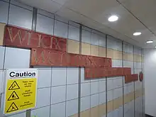 In the summer of 1969, David Palmer, a counsellor at UCLA and his family were touring the Cotswolds in England when they were directed to Bryant Fedden's Tan Yard Bank workshop by an owner of one of his name plate works. David Palmer was given a tour of the workshop by Bryant Fedden. It was during this tour that David Palmer saw an alphabet slate and in his words "I fell in love with it".[44] David Palmer could not afford to buy it but Bryant Fedden said that he could take it and perhaps find a buyer for it. David Palmer placed the slate in his touring van and then carried it onto the plane back to the USA. On arrival the slate was initially put on display at the UCLA Student Bookstore and then, after a period in storage, was moved to the School of Library Service at UCLA in the Powell Library basement.[45] It was on display in the Horn Press Chappel a group developed to utilise letter presses as part of a "Typography and the Graphic Arts" course developed by Professor Andrew H. Horn.[46] David Palmer published a small pamphlet cataloguing the journey of the slate from Winchcombe to UCLA entitled "The Bryant Fedden Slate: : Its Journey from Gloucestershire to the UCLA Library School" and used the Horn Press facilities to print it.[47] In 1992 the School of Library Service now named Graduate School of Library and Information Science moved to a new smaller building and the Horn Press Chappel was disbanded and the slate was moved to the Graduate School of Library and Information Science. In 1994 the Graduate School of Library and Information Science was incorporated into the UCLA Graduate School of Education and Information Studies (GSEIS).[48]