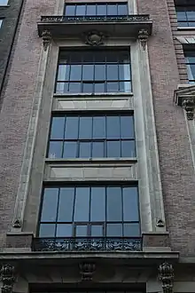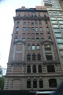 The facade is made of pink brick, stone, and terracotta.[3][17] When the Bryant Park Studios were built, the facade was visible on all sides, though subsequent development obscured the south and east elevations.[18] The north elevation facing 40th Street, as well as the west elevation on Sixth Avenue, remain visible and are both divided into three horizontal sections: a base, midsection, and upper section.[10][19] The 40th Street elevation is divided vertically into five bays.[16] The building has wide studio windows on 40th Street, which generally measure 12 by 12 feet (3.7 by 3.7 m).[20] The Sixth Avenue elevation is generally arranged as a central bay flanked by two end bays.[21]