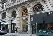 The ground floor and basement originally housed the Cafe des Beaux Arts, which had a kitchen and a ratskeller, or German beer hall, in the basement.[25] The restaurant featured a women's-only bar, which in the early 20th century was still relatively uncommon.[26] As of 2019, the ground-floor space was occupied by a branch of bakery chain Ole & Steen, which also had a 225-square-foot (20.9 m2) mezzanine above the ground floor.[27]